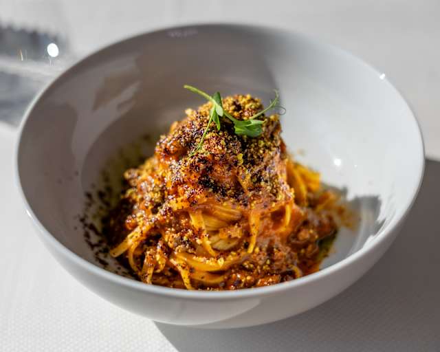 - Handmade tagliatelle, wild boar ragù, dark chocolate, chopped pistachios