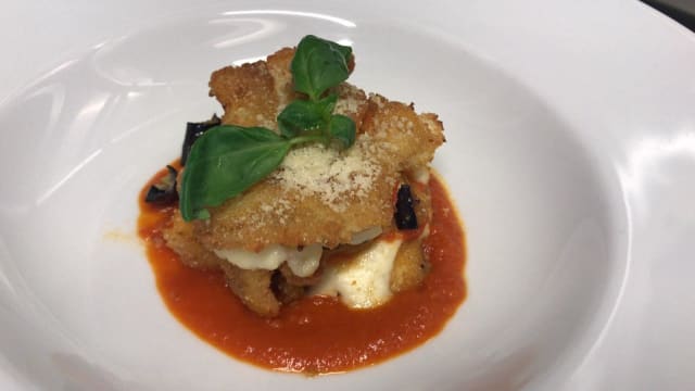 Ravioli stuffed with smoked mozzarella, ricotta cheese and eggplant served with tomato sauce