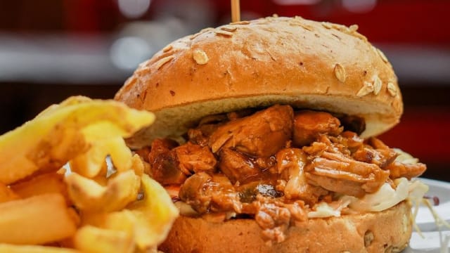 Pane* bun artigianale, hamburger scottona piemontese 200g, melanzane e zucchine grigliate, scamorza affumicata con salsa bbq