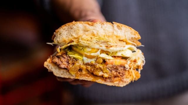 Pane* bun artigianale, hamburger angus di irlanda 200g, bocconcini di bufala, uovo occhio di bue, pomodoro, cavolo cappuccio, crema di cipolla, salsa jack e pesto di basilico