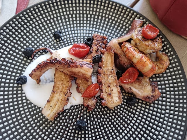 Piovra e mazzancolle alla griglia su crema di zucca e olive nere disidratate