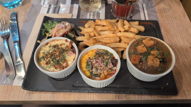 7/10The Fork discount applied - friendly and helpful staff, food good/tasty probably a little more expensive than it warrants. I had the trio of dishes which was a good way to taste 3 spécialités in one sitting.