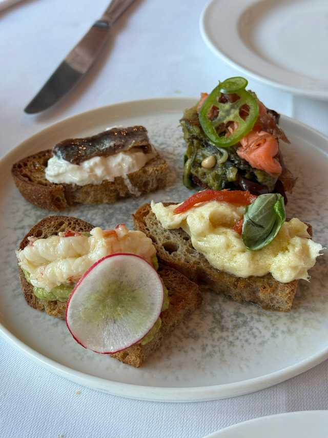 - Bruschette di mare con gambero Reale e guacamole, acciughe del Cantabrico con burrata, salmone selvaggio d’Alaska marinato e scarola strozzata, baccalà mantecato