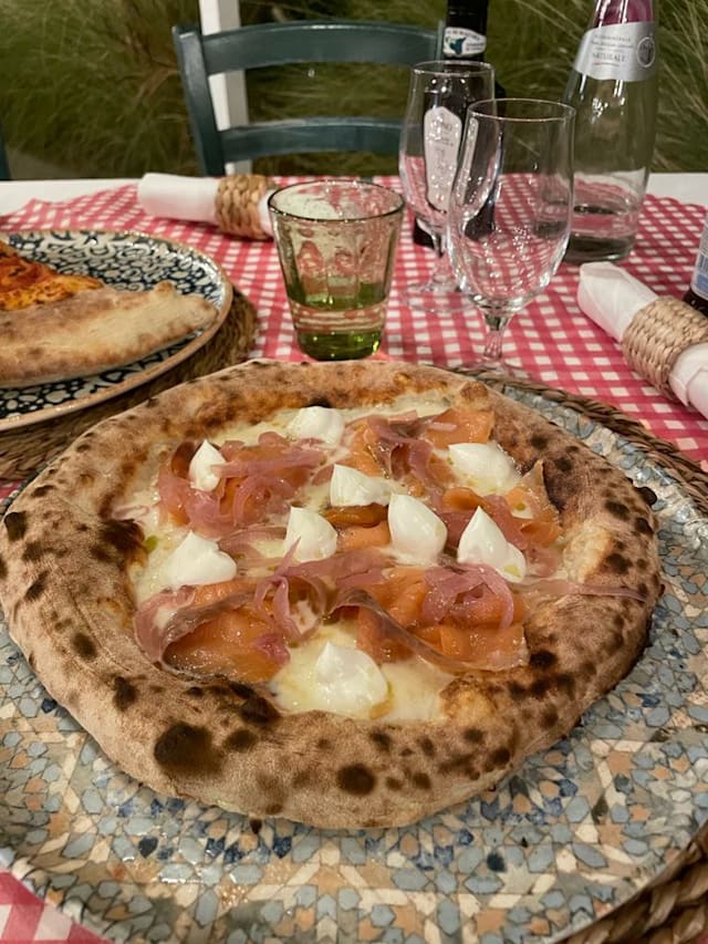 Pomodoro, mozzarella fior di latte, prosciutto crudo di parma, pomodorino, rucola e scaglie di grana