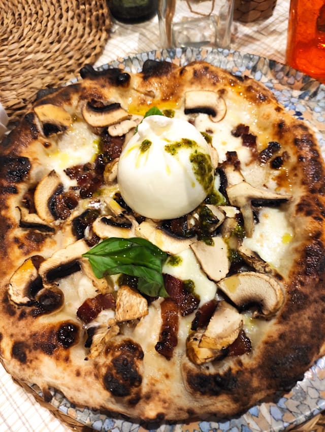 Mozzarella fior di latte, burrata, funghi e guanciale croccante