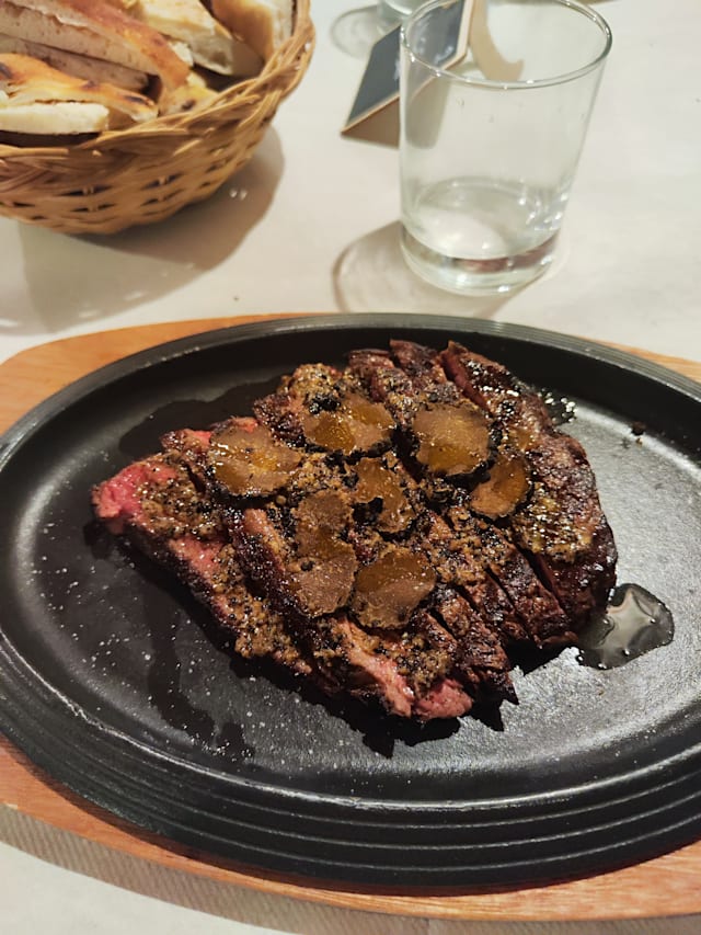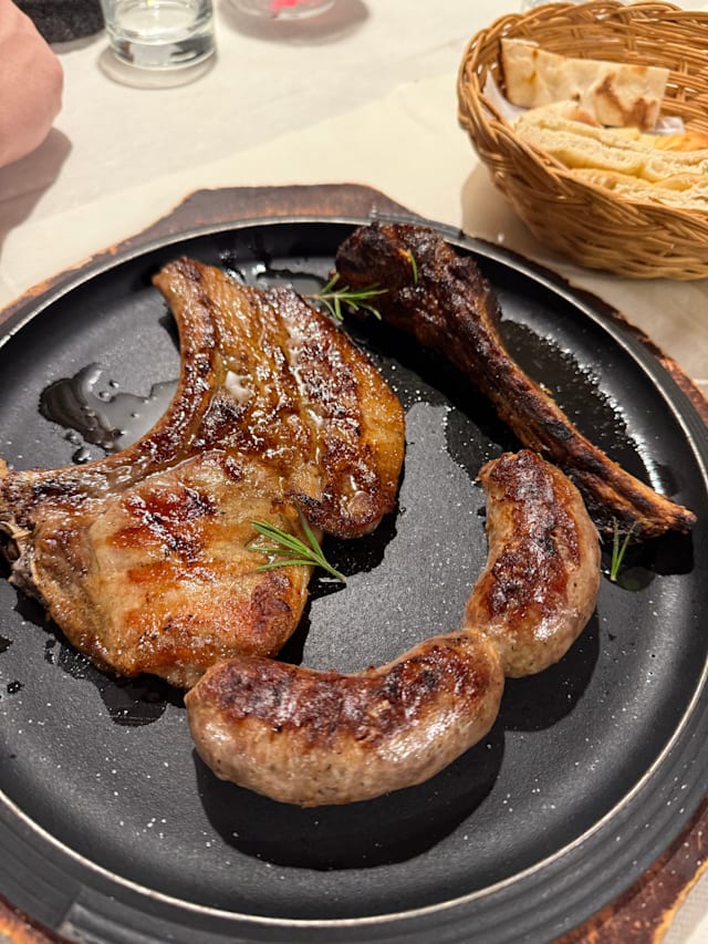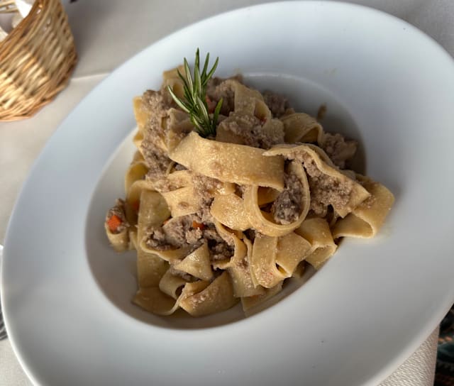 4.5/10The service was good the steak main was very nice They gave us a complimentary glass of prosecco but it was flat the "bread" basket was like a tale pizza base heated up the zucchini courgette flowers had no taste, they needed a sauce or fresh lemon etc the wild boar ragu with pasta, the wild boar had no ragu and again no flavour, it was like fried minced pork with no seasoning
