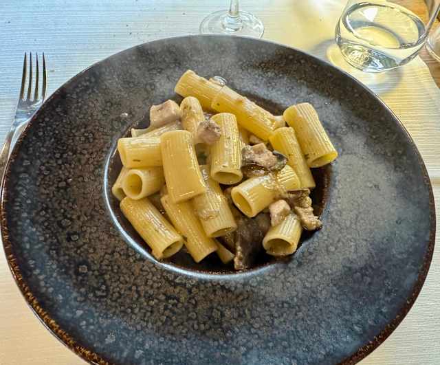 - Mezzo pacchero con crema di carciofi, cozze e carciofi croccanti