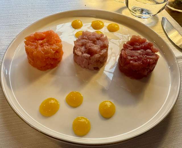 - Polpo su crema di ricotta aromatizzata al limone, pepe rosa e olio alla rucola