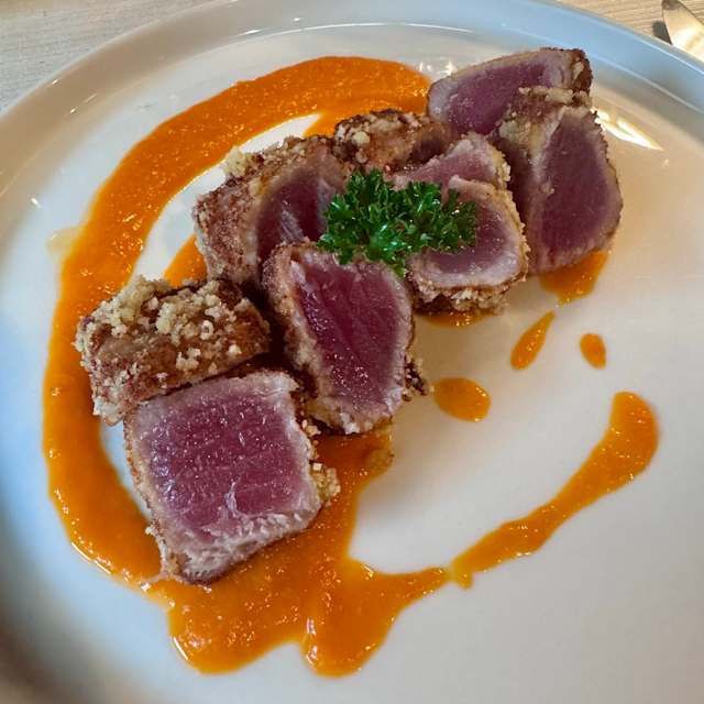 - Tonno scottato con crumble di tarallo e mandorle su centrifuga d’’uva rossa