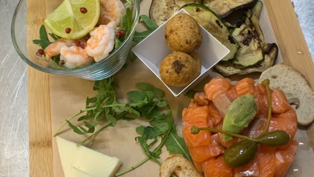 Salsa di pomodoro, mozzarella, capocollo, zucchine alla poverella, burrata, insalata