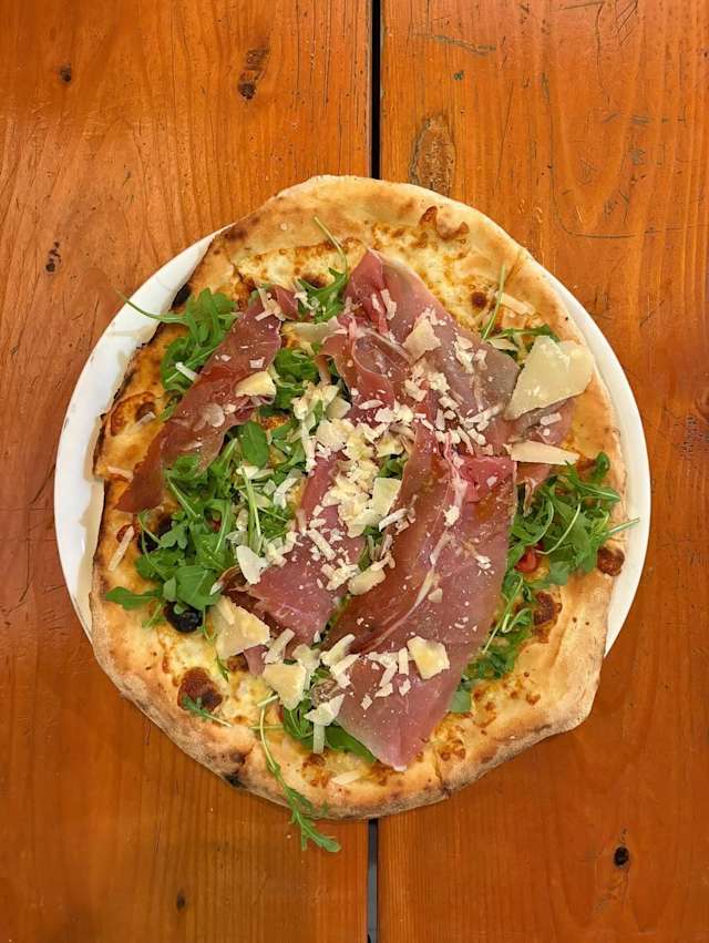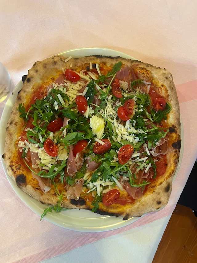 - Pomodoro, mozzarella, prosciutto crudo di Parma, pomodorini freschi, scaglie di grana, rucola.