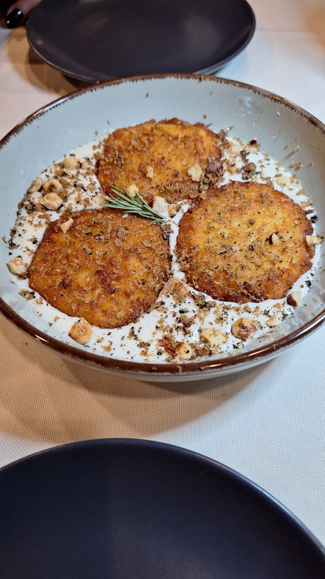 Rosti di patate con tartufo nero, nocciole e vellutata cremosa alla provola