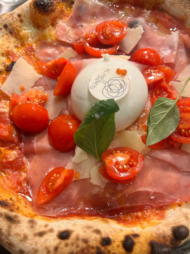 - Pomodoro ,fiordilatte di agerola ,pancetta ,cipolla , scaglie di parmigiano
