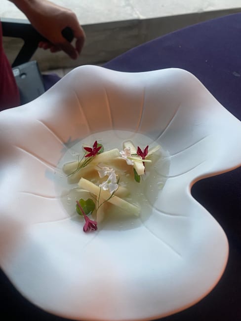 6.5/10Location is nice though we were overlooking a boring lawn, no water. We had a meat Menü-fire-and a vegetarian menue-Earth. The presentation of the dishes was nice but it was not tasty. It was just a mixture of everything but the taste was not there. Quite disappointing. The service was good but they did not try to make a conversation. Even sommelier only mentioned the wine region without any further comments. I would expect to have more details. I do not understand a high rating maybe there was a different Menü before. It was overpriced with no taste.