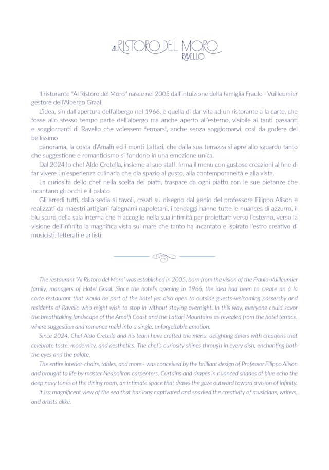 Dear sir, we thank you a lot for your wonderful review and are happy that you have enjoyed our meals. Our young chef Aldo provides daily with fresh local products to create these dishes in a potpourri of flavours and sensations. The restaurant “ Il Ristoro del Moro” is the only with a wonderful position on the Coast and its breathtaking view is incomparable. We hope to welcome you again in our Paradise