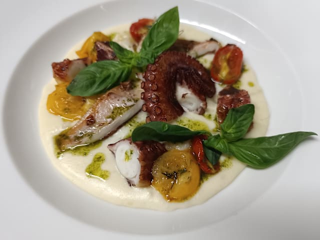 - Polpo arrosto su cremoso di patate ,gocce di basilico e couline di conffit