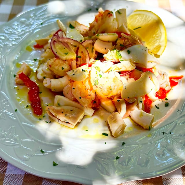 seppia, gamberi, pomodorini, cipolla di Tropea e peperoni