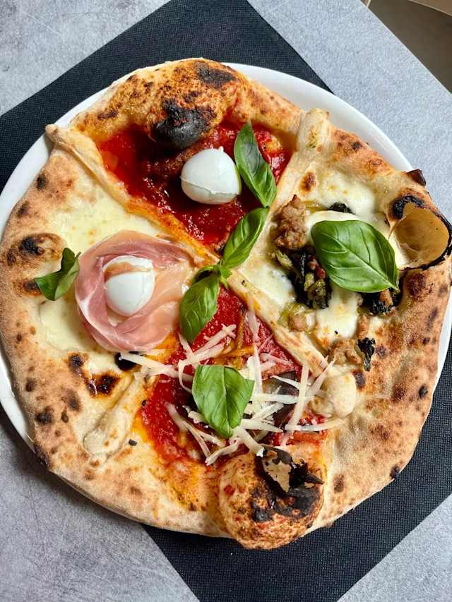 - Pomodoro san marzano, fior di latte, carciofi, funghi champignon, prosciutto cotto, olive taggiasche, basilico e olio evo