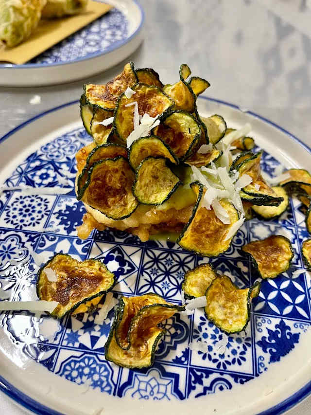 - Timballo di pasta con besciamella, crema di zucchine, chips di zucchine e scaglie di provolone del monaco
