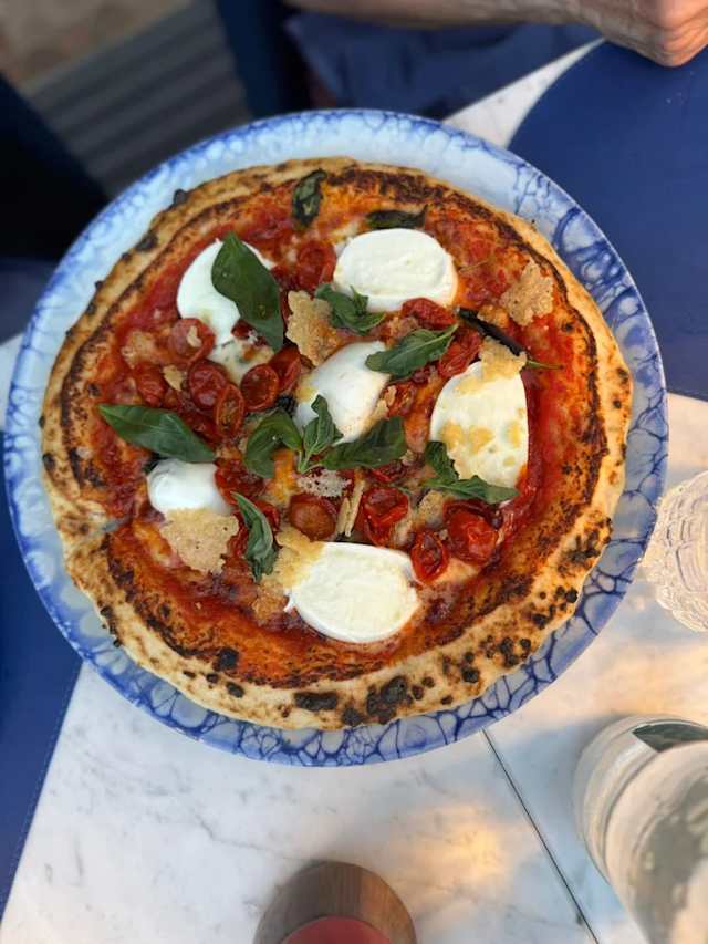 - Pomodoro san marzano, fior di latte, acciughe, olive taggiasche, basilico e olio evo