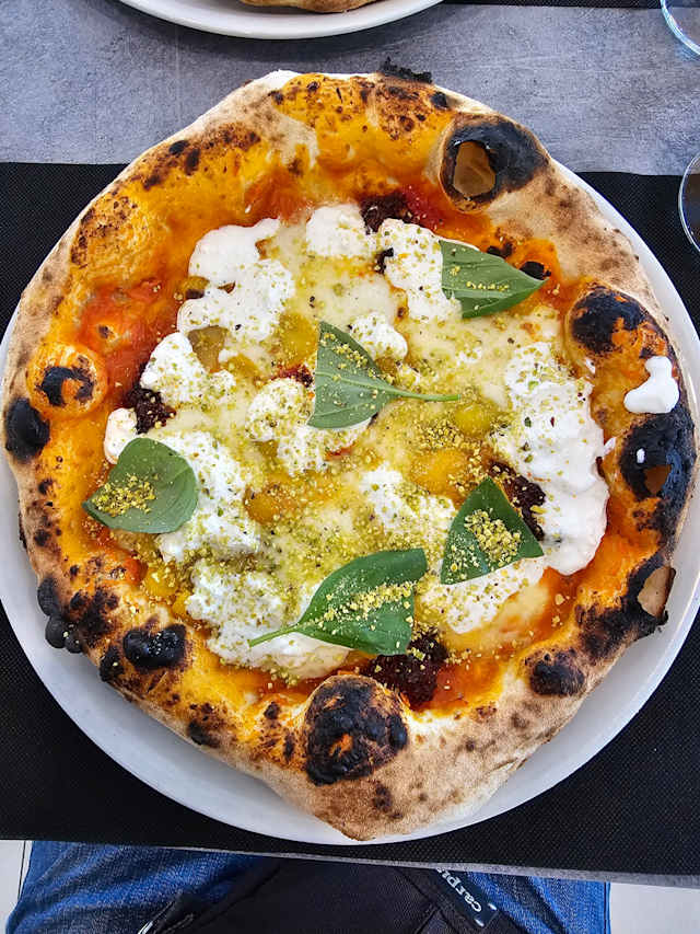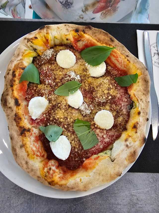 - Base fior di latte, spianata calabra, nduja di spilinga, in uscita tarallo napoletano sbriciolato, fondita di cacio e pepe, olio evo e basilico