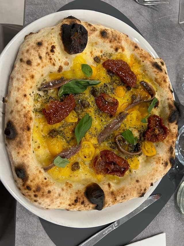 - (Crema di pomodorino datterino giallo, in uscita capperi croccanti, acciughe di cetara, olio all'aglio, pomodori secchi, origano e olio evo)