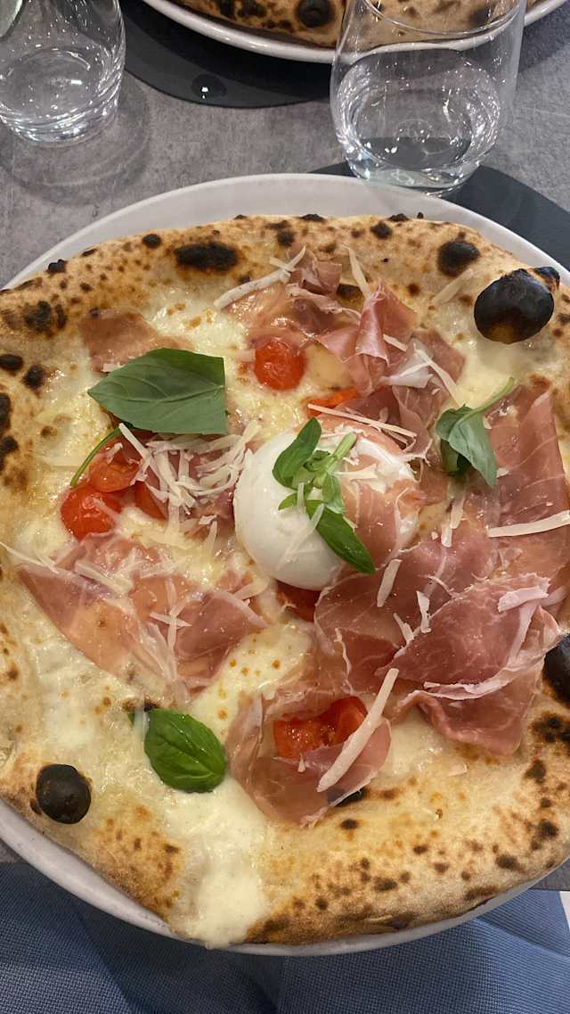 - (Base fior di latte, pomodorino ciliegino, in uscita rucola, prosciutto crudo, burrata pugliese da 125gr, scaglie di grana e olio evo)