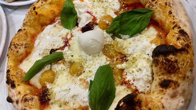 - (Crema di pomodorino datterino, mozzarella di bufala campana, nduja di spilinga, datterino giallo, in uscita stracciatella di burrata pugliese, granella di pistacchio, basilico e olio evo)