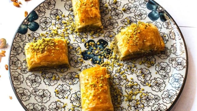 1 pincho kufta acompanado de berenjena asada al estilo oriental servido con arroz blanco y frutos secos