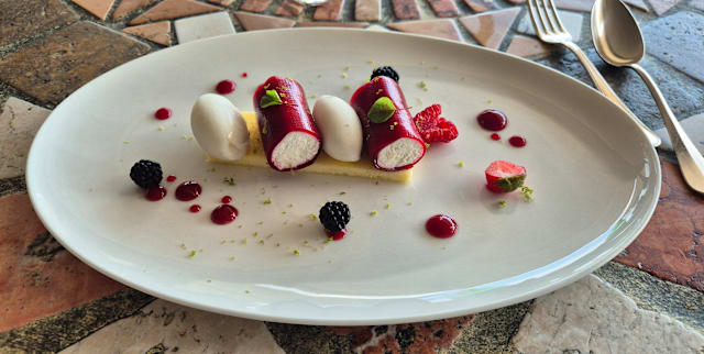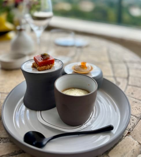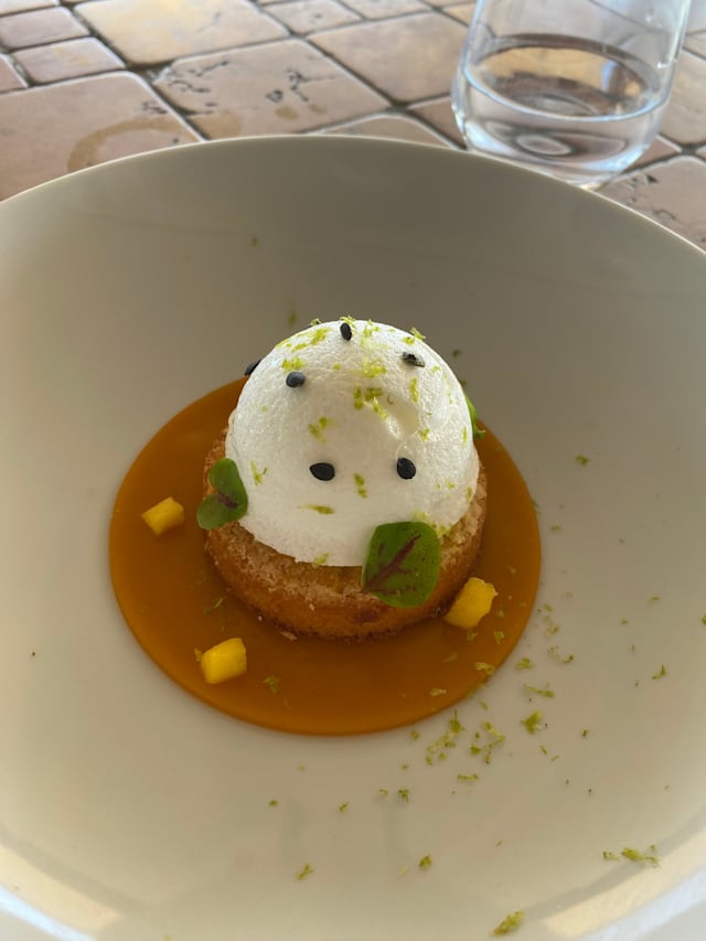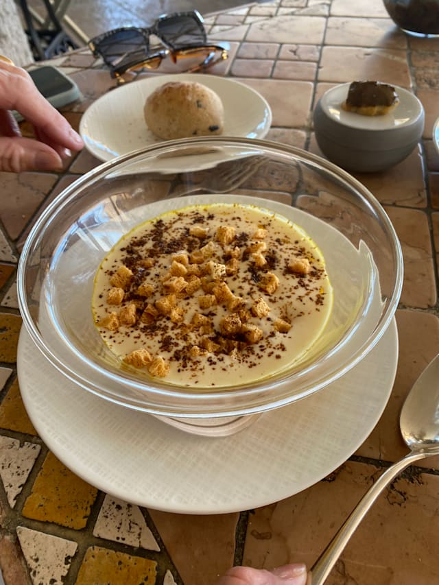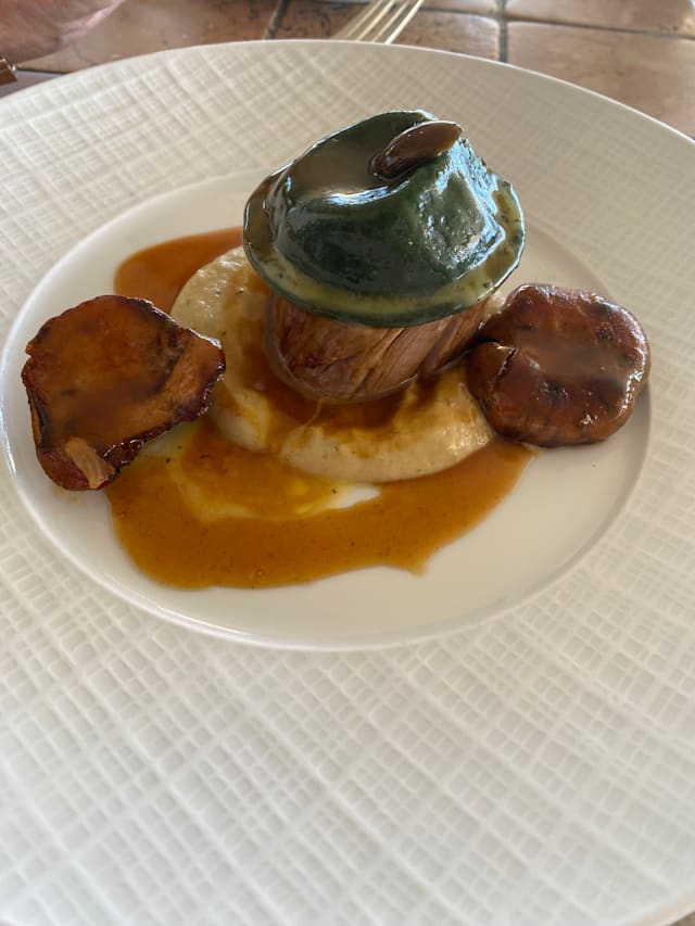 10/10The elegant terrace commands a fine view of St Paul de V and surrounding coutntryside. There were three menu options. we chose the Menu du Marche. Original pairings and flavours thoughout. To start, pan fried foie gras came in a scented almond milk mousse on a cherry tartlet. Exceptional and unusual. Then veal filet, served slightly pink, with mini croquette and gravy reduction. Again both seasoning and presentation almost perfect. We avoided the cheese plate as too robust in such hot weather, and followed instead with the red fruit pavlova. The lunch was discretly presented and the bill in line with expectation. We did not explore the wines but feel sure the sommelier would have guided us expertly.