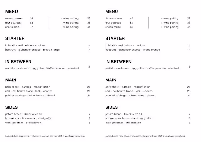 10/10The restaurant paired each course with wines that elevated the meal. Service was friendly and knowledgeable, guiding me through the chef’s choice menu and pairings without being pushy. Standouts were the pasta dish and the pork: the pasta was delicate and beautifully balanced, and the pork was rich and perfectly cooked — both were the highlights of the evening. Other memorable dishes included a raviolo with crispy white capers and seaweed mayonnaise, and smoky barbecued beetroots on young goat cheese with blood orange and red currant. Portions were well judged for a tasting menu.