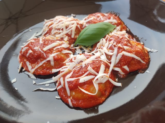 Scrigni ripieni di ricotta al pecorino di pienza e pinoli al sugo di aglione dop