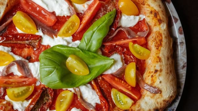 San marzano dop, stracciatella mantecata alla colatura di alici, alici del cantabrico, polvere di capperi di pantelleria igp, origano