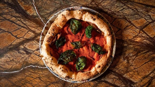 San marzano dell'agro sarnese nocerino dop, bufala campana dop fuori forno, basilico, crema di basilico, olio mono varietale tenera ascolana "agorà" (consigliata con variazione salsa di san marzano giallo dop)