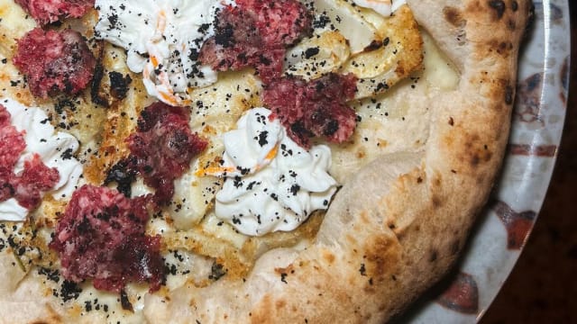 Sugo di pomodoro stracotto al guanciale, fiordilatte, guanciale artigianale country pig, mix homemade di 5 pepi tostati, pecorino romano
