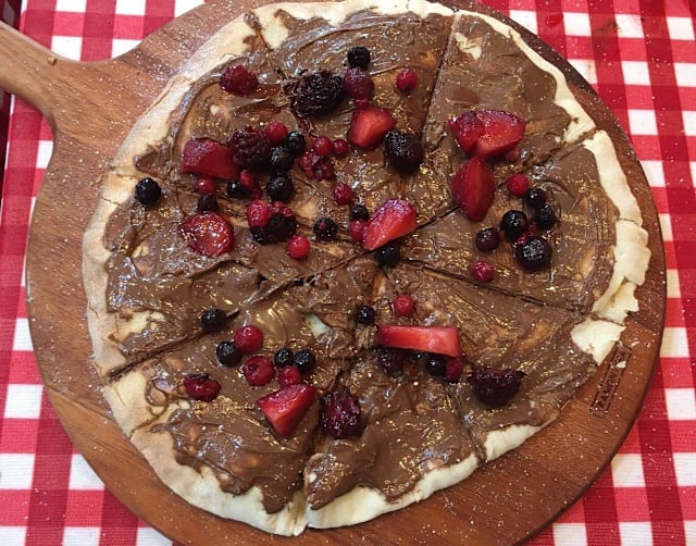 Molho de tomate, mozzarela, chouriço, cebola, pimentos, azeitonas e tomate