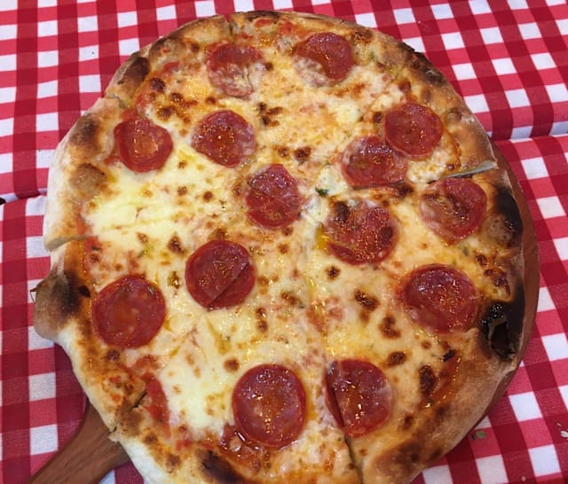 Molho de tomate, mozzarela de búfala, manjericão com pepperoni e azeite picantes