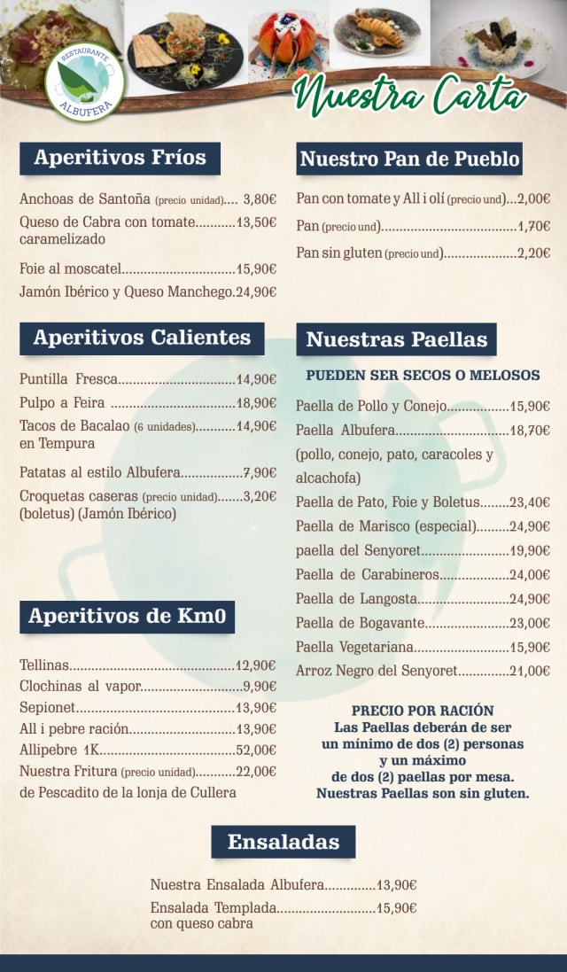 6/10From the reviews we were expecting better. Thecwaiter wasn’t helpful or pleasant throughout the meal. We started with Gambas which were okay but €30 for 6 prawns… the lamb cutlets had about an ounce of meat on €15 and I have the cutlets regularly and I know that the lambs has very little meat on but this was ridiculous and embarrassing to even serve. We then had the paella albufera there own paella which was nice … I did see other dishes coming out that looked okay….. just not the cutlets I think o was just a bad day for cutlets ! Overall worth visiting however quiet expensive and very commercial for Spain … the restaurant was very clean and we sat out side in the square which was pleasant however the inside views over the rice fields looked better and it’s a huge restaurant to accommodate 150+ covers. 7/10