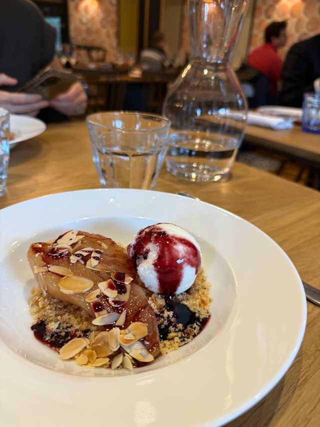 Poires pochées, vanille-verveine, réduction de porto, sablé amandes, glace du moment