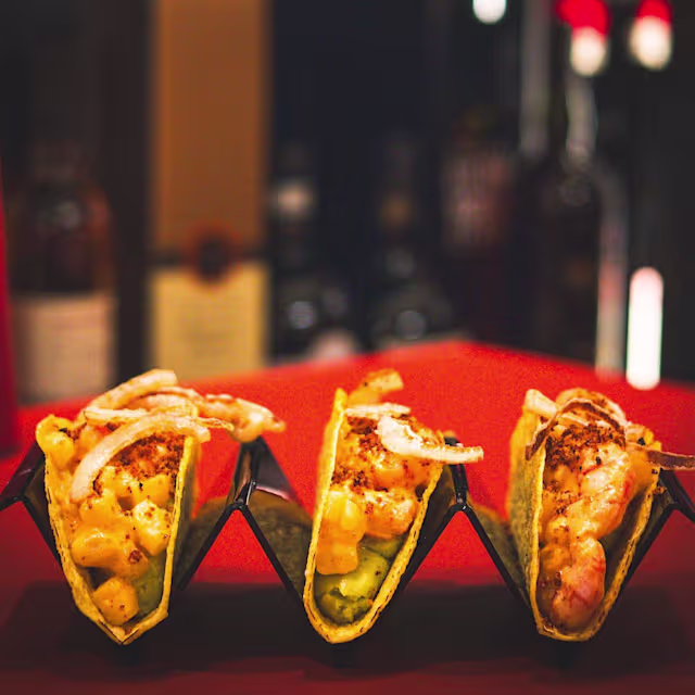 - Tacos (2 pz) di mais ripieno con gamberi scottati, avocado, maionese al chipotle, patate e fiocchi di cipolla