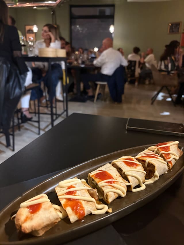 sfoglie di riso ripiene di provolone con zucchine alla scapece, crema di zucchine e maio di alici 2 pezzi