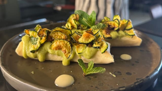 sfoglie di riso ripiene di provolone con zucchine alla scapece, crema di zucchine e maio di alici 2 pezzi