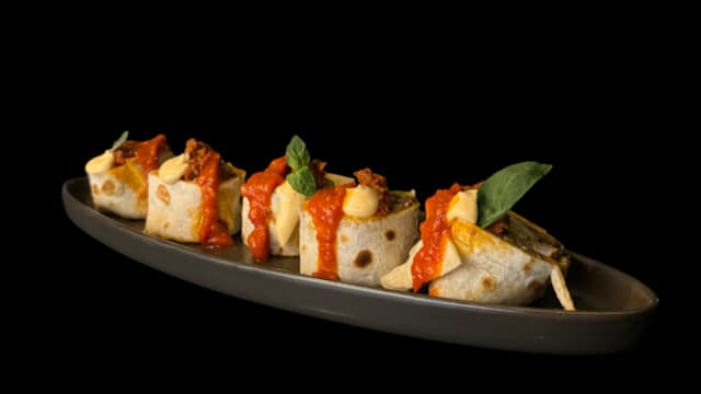 Piadina alla piastra con kebab di pollo, maiale e manzo, crema di pomodori secchi, maionese piccante e salsa thai home-made