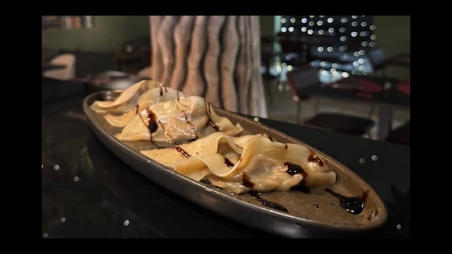 Ravioli coreani saltati in soia con crema di patate, fonduta di provola al basilico e salsa chili 5 pezzi