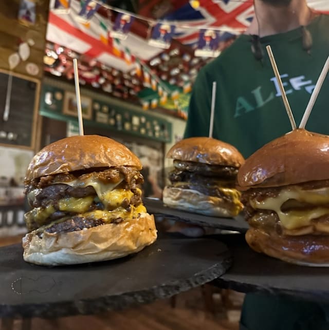 - Buns artigianale, hamburger 180 gr di pura scottona di charolaise, patate stick croccanti, bacon croccante, blue stilton fuso(gorgonzola inglese) con 2 fette di cheddar, salsa baconnaise