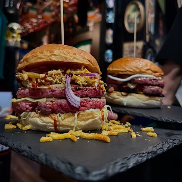 - Buns artigianale, doppio hamburger di pura charolaise 360 gr, BBQ, uova occhio di bue, iceberg, bacon croccante, provola fusa, pomodoro, cipolla fresca