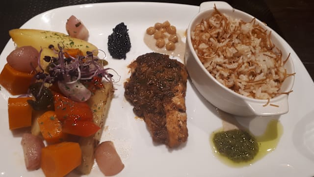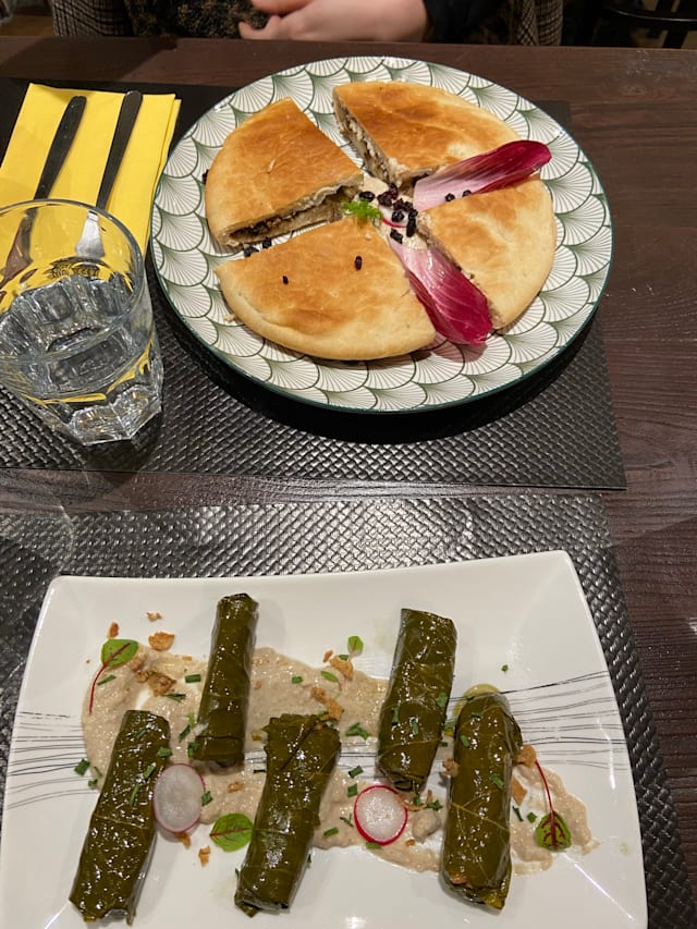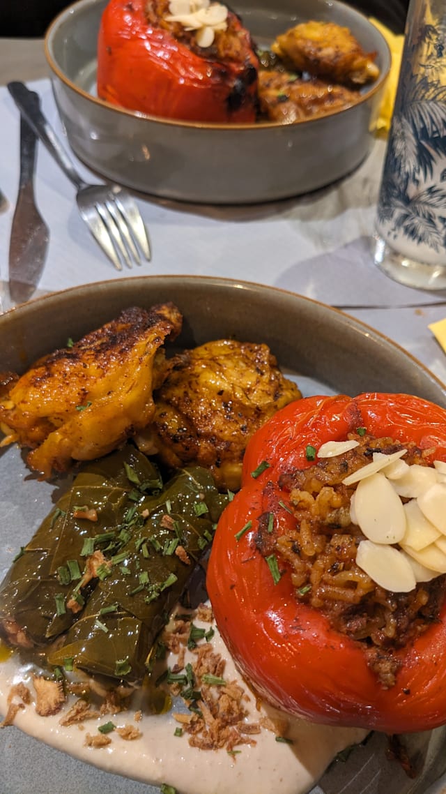 Poivron farci au riz, babaghanouj (caviar d’aubergine à la crème de sésame), roulés de feuilles de vigne et poulet rôti