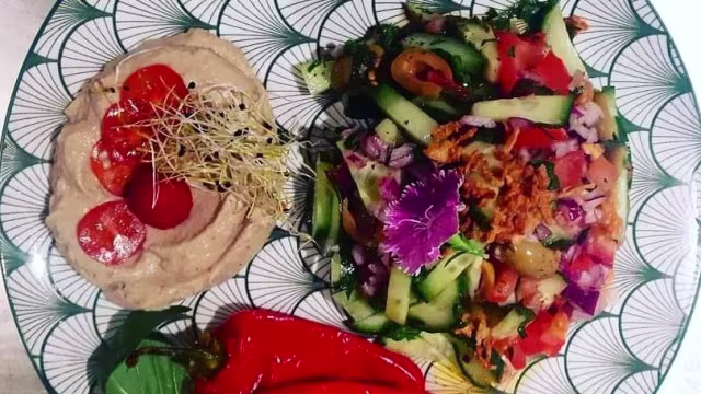 - Poivron farci au riz, babaghanouj (caviar d’aubergine à la crème de sésame), roulés de feuilles de vigne et poulet rôti
