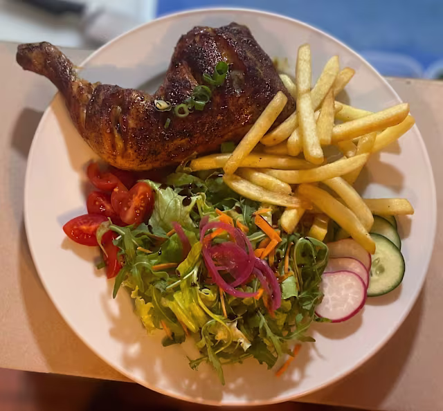 - (Spicy grilled chicken leg with fries/rice with salad)