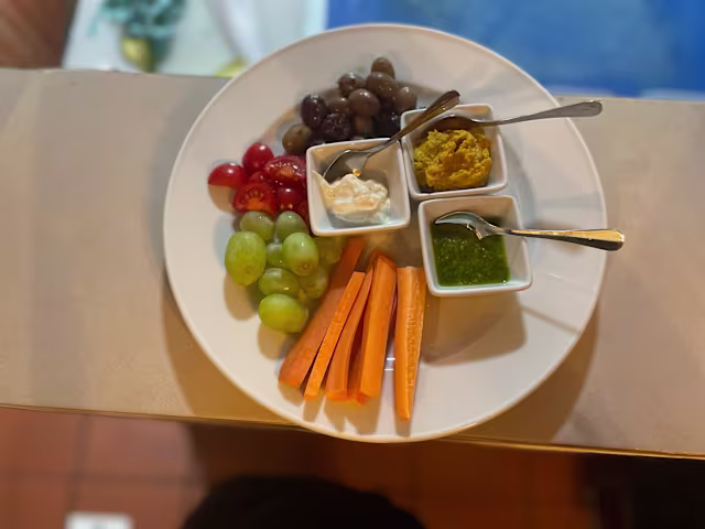 - (Bread, olives, homemade cheese paste, humus, pesto, carrot, cherry tomato, fruit)